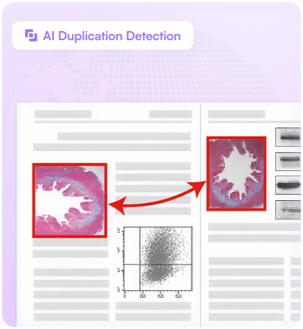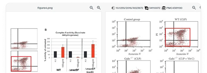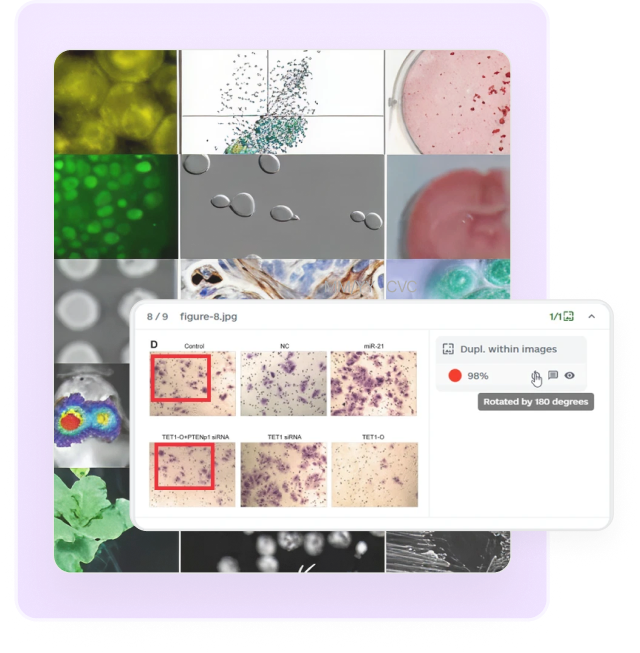 Detects identical, cropped, rotated, flipped, or resized figures across manuscripts and published literature.