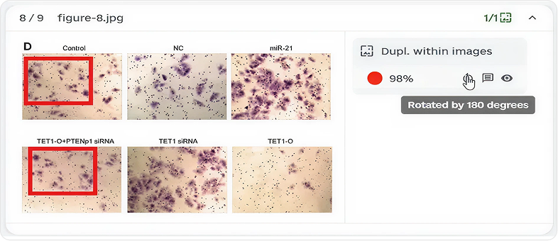 Imagetwin detects a broad range of duplication types, including exact duplicates, cropped or resized reuse, rotated or flipped images, brightness and contrast adjustments, partial or cloned regions, and plagiarised figures from published articles. Detection works both within a single manuscript and across published literature.